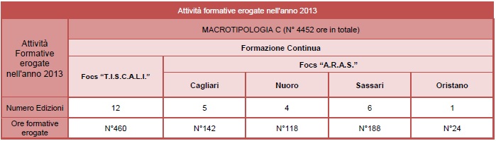 Tabella 1. Attività formative erogate nell’anno 2013 per la Macrotipologia C – Formazione Continua della sede di Cagliari